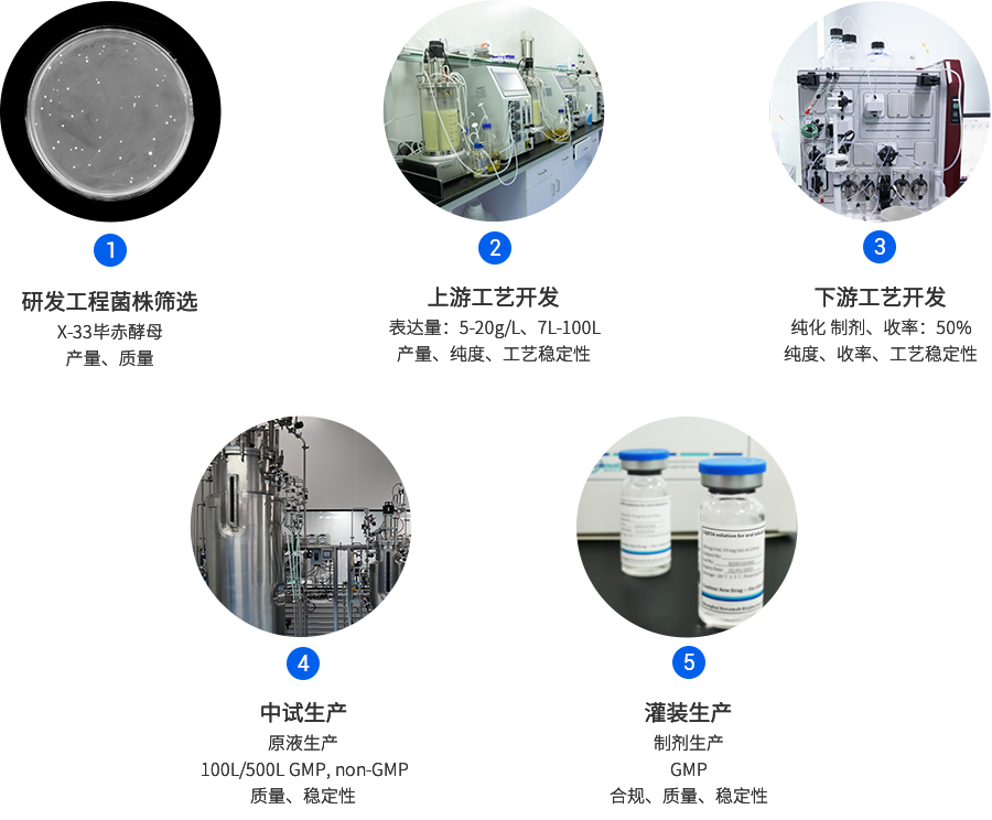 Ebpay生物已成功建立毕赤酵母CMC平台,现在已具备多个完整项目开发经验。毕赤酵母CMC平台90%以上的项目产量在1g/L以上,纯化平台工艺,其整体回收率在50%以上。从细胞株构建到蛋白纯化仅需3-4个月,极大地缩短了项目开发时间。